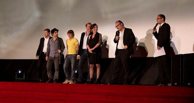 L’équipe du film enfin sur scène avec Patrick Quinet le producteur à l’extrême-gauche du cliché. [Photo FIFF]