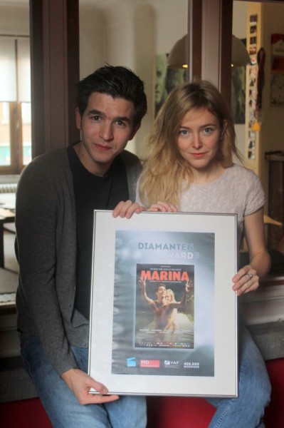 ‘Marina’ heeft de kaap van de 400.000. toeschouwers overschreden. Heel knap.  Dat betekende meteen dat de makers een omlijste affiche ontvingen, waarop vermeld stond dat hun film tot nu toe al goed was voor 400.000 bezoekers.  Zoiets heet ‘De Diamanten Award’.  Die omlijste affiche werd overhandigd aan Matteo Simoni en Evelien Bosmans.  De Gouden, Platina en Diamanten Award (voor respectievelijk 100.000, 200.000 en 400.000 bezoekers) werd voor Vlaamse filmproducties in het leven geroepen door de vzw Les Films du Bord de Mer (Filmfestival Oostende) met de steun van het VAF/Filmfonds.